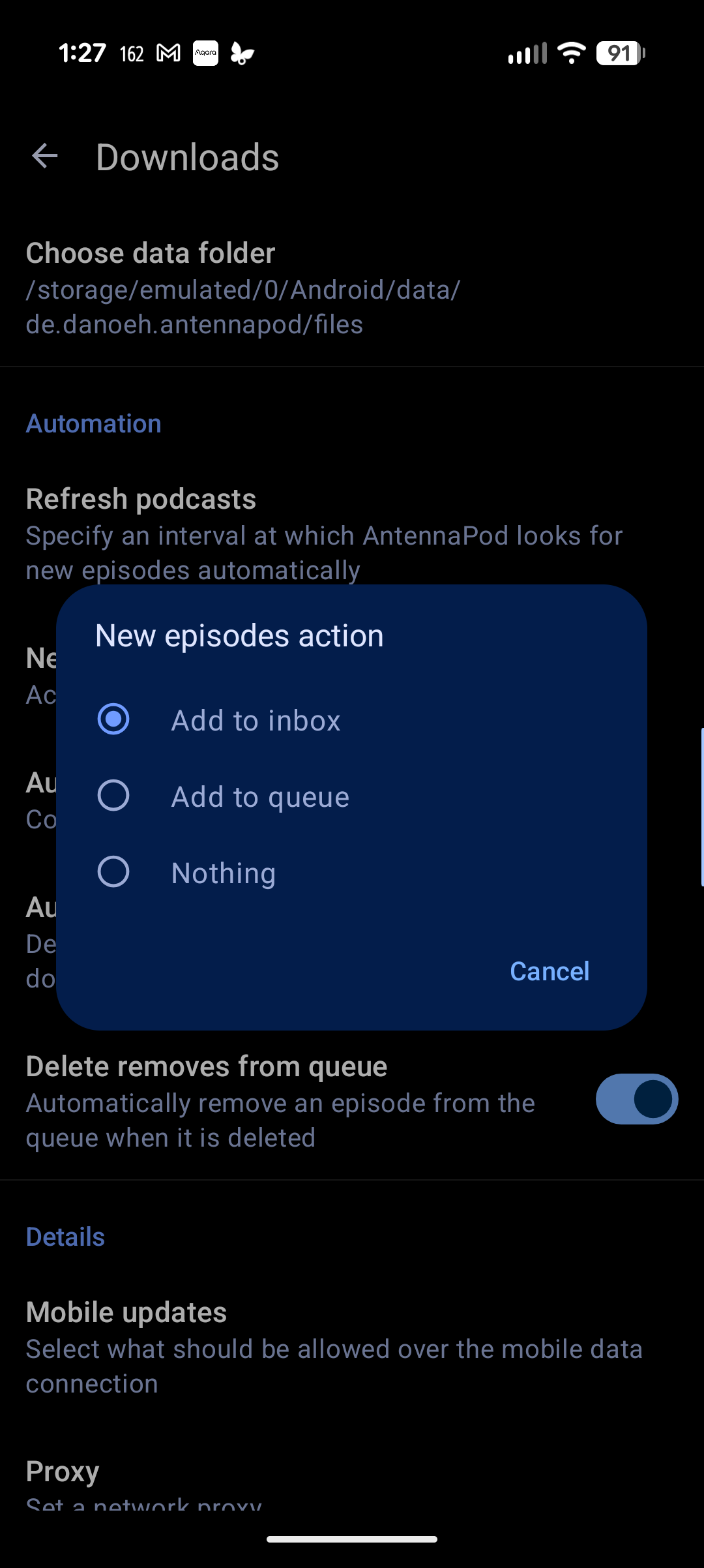 Expected behaviour: I’d like Antenna Pod to find a new episode, download it and add it to the queue